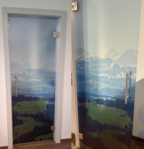Das nachfolgende Bild zeigt eine Glaspendeltüre in einem Büro mit einem transparenten Digitaldruck.